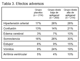 Grupo dosis baja de aptiganel: 3 mg de aptiganel en bolo intravenoso seguido de infusión intravenosa continua de 0,5 mg/h durante 12 h hasta un máximo de 9 mg.