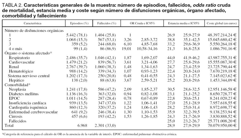 Según la tabla 2, las disfunciones orgánicas más frecuentes fueron la renal (39,7%) y respiratoria (35,7%). Un total de 570 pacientes presentaron disfunción renal y respiratoria simultáneamente. El 78,1% de los pacientes presentó un único fracaso orgánico. Un total de 4.294 pacientes (61,6%) presentaban además de sepsis severa alguna de las siguientes patologías: neoplasia, diabetes mellitus, enfermedad pulmonar obstructiva crónica (EPOC), insuficiencia cardíaca, cardiopatía isquémica, enfermedad cerebrovascular o cirrosis. La mortalidad global intrahospitalaria fue de un 33%, con un total de 2.301 fallecimientos. El riesgo de fallecimiento se incrementa con el número de órganos afectados. Es especialmente alto en el fracaso hepático o cardiovascular y menor en la disfunción neurológica. Las neoplasias y las cirrosis son las comorbilidades con mayor mortalidad, presentando la diabetes y la EPOC valores de riesgo inferiores al total de la muestra. La estancia es significativamente más prolongada en los episodios con 2 ó 3 disfunciones orgánicas, con fracaso respiratorio (44 días) y en aquellos con enfermedad cerebrovascular o neoplasia. En los casos con fallecimiento es significativamente inferior al promedio global (25 días). Por fallos orgánicos, destacan los costes asociados con el tratamiento de fallos respiratorios, renales y cardíacos. Con respecto a la comorbilidad, el mayor coste se observa en pacientes con neoplasias.