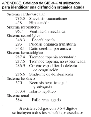 La unidad de análisis de este trabajo es el episodio de sepsis grave. Se definieron como episodios de sepsis grave aquellos registros de la base de datos de altas del CMBD en los que existía la presencia de disfunción orgánica y presencia de infección. Se consideró cultivo positivo la codificación de un diagnóstico de infección por un microorganismo especificado. Las disfunciones orgánicas que se consideraron fueron: respiratoria, cardiovascular, renal, hepática, hematológica o neurológica. Los episodios se identificaron a partir de la combinación de códigos de enfermedad y códigos de procedimientos de la CIE-9-MC utilizando los criterios propuestos por Marshall14 y utilizados posteriormente por otros autores12,13. Los códigos utilizados se muestran en el apéndice. La presencia de comorbilidad subyacente se determinó a partir de la presencia de los códigos correspondientes en los campos de diagnósticos secundarios15. El coste estimado de cada alta se calculó en función del peso asignado al GDR que le corresponde, lo que representa el coste previsible de este tipo de pacientes con respecto al coste medio global en hospitalización de procesos agudos.