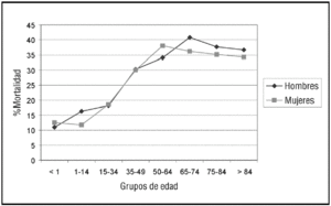Figura 2. Mortalidad de sepsis grave hospitalizada por sexo y grupo de edad.