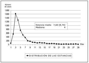 Se han incluido 6.868 pacientes ingresados en 85 UCI pertenecientes a 80 hospitales (media de 80,8 pacientes por UCI, mínimo 15, máximo 206). Las características demográficas, la patología de base, los marcadores de gravedad y la estancia media se incluyen en la tabla 1. La media de edades fue de 60,0 años (DE = 17,3), predominado los hombres (68,5%), con patología de base médica (39,4%) y coronaria (31,8%). El nivel de gravedad, expresado mediante el APACHE II, tuvo una media de 13,5 (DE = 8,1) y una mediana de 12 y la estancia media fue 7,6 días (DE = 8,7) con una mediana de 4 días. En la figura 1 se incluye la distribución de los enfermos según la estancia.