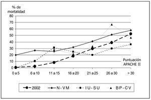 Durante el período de vigilancia han fallecido en la UCI 837 pacientes (12,2%). La mortalidad se ha modificado en función de patología de base (4,4% en pacientes coronarios, 20,6% en pacientes médicos, 10,7% en pacientes traumatológicos y 8,3% en pacientes con cirugía programada), y el nivel de gravedad de los pacientes estudiados (fig. 2). La mortalidad global de los pacientes con N-VM fue 129/382 (33,8%), con IU-SU 52/208 (25%) y con BP/B-CV 66/207 (31,9%).