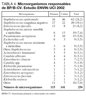 Las tasas de bacteriemia primaria (incluidas las relacionadas con catéteres) es 3,4 bacteriemias por cada 100 pacientes ingresados más de 24 horas en UCI, 6,2 bacteriemias por cada 100 pacientes con catéter vascular, 4,8 bacteriemias por cada 1.000 días de estancia y 4,5 bacteriemias por cada 1.000 días de catéter vascular. En el período analizado se utilizó catéter venoso central durante 30.525 días y catéter arterial durante 21.692 días (ratio de utilización de catéter vascular, 1,1). Los microorganismos responsables de estas infecciones se incluyen en la tabla 4, diferenciándose las asociadas con catéter vascular de las bacteriemias primarias.