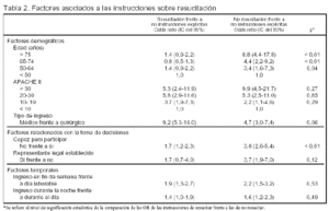 El estudio de los factores demográficos demuestra: a) los factores demográficos son los que más afectan a la probabilidad de tener instrucciones sobre resucitación; b) la probabilidad de tener instrucciones de no reanimación es mayor cuando aumenta la edad; c) la probabilidad de tener instrucciones, tanto de reanimación como de no reanimación aumenta cuando se incrementa el valor APACHE II; d) la probabilidad de tener instrucciones, tanto de reanimación, como de no reanimación es mayor en los enfermos médicos que en los quirúrgicos, y e) la probabilidad de que las instrucciones explícitas sean de resucitar en lugar de no resucitar es mayor en los enfermos médicos que en los quirúrgicos.