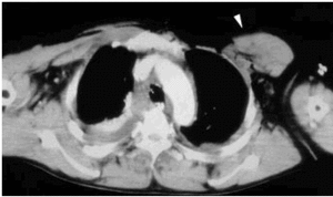 La palpación detectó un espacio vacío en la región infraclavicular izquierda. Se realizó una TC de tórax al ingreso, que puso de manifiesto la presencia de una contusión pulmonar izquierda con derrame pleural bilateral, y en la pared torácica una desinserción del músculo pectoral mayor izquierdo en su unión con la articulación condrosternal, con retracción lateral del vientre del músculo.