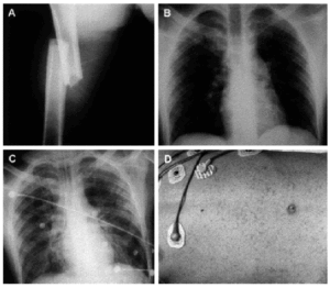 Varón de 18 años que ingresó por una fractura del fémur derecho con acabalgamiento a consecuencia de un accidente de tráfico (fig. 1A). En el momento del ingreso, la radiografía de tórax fue normal (fig. 1B). A las 3 h del accidente, el paciente comenzó con agitación seguida de coma y taquipnea con cianosis. Una nueva radiografía de tórax mostró infiltrados alveolares bilaterales (fig. 1C) y la exploración cutánea reveló un exantema petequial diseminado toracoabdominal (fig. 1D). Puesto que hubo una relación PaO2/FiO2 < 100, el paciente fue intubado y conectado a ventilación mecánica con FiO2 de 1 y PEEP + 10 cmH2O. El enfermo tuvo una evolución favorable, aunque presentó alteraciones de la conducta durante 2 meses. El diagnóstico fue embolia grasa con edema pulmonar y petequias diseminadas.
