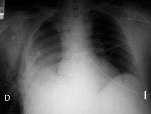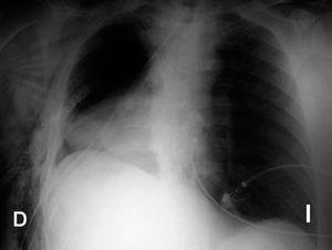A las 24 horas del postoperatorio y tras extubar al paciente se detecta una imagen radiodensa de forma homogénea en la región inferior de hemitórax derecho (fig. 2) que hace pensar en un nuevo sangrado. En la exploración se aprecia un latido cardíaco débil en hemitórax izquierdo y mucho más intenso en lado derecho, con latido apical visible en sexto espacio intercostal derecho. En la ecocardiografía transtorácica se confirma la sospecha diagnóstica de herniación cardíaca a través de la ventana pericárdica. El paciente fue reintervenido para reintroducir los ventrículos en la cavidad pericárdica y el parche sintético fue sustituido por haber sufrido dehiscencia de suturas, lo que permitió la herniación. El paciente permaneció asintomático en todo momento.
