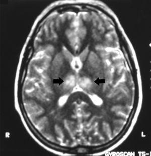 Figura 2. Imagen potenciada en T1, hiperdensidad en ambas regiones talámicas