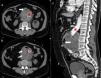 Imagen de la TAC del abdomen. Aneurisma abdominal trombosado con la endoprótesis en su interior (estrella roja). En la cara anterior del aneurisma (fig. a) se aprecia una porción de asa del duodeno que contacta con la pared del mismo, no existe plano de separación y en su lugar se observa una burbuja de aire (flecha). En otros cortes (figs. b y c) se aprecian múltiples burbujas de aire en el espesor del trombo.