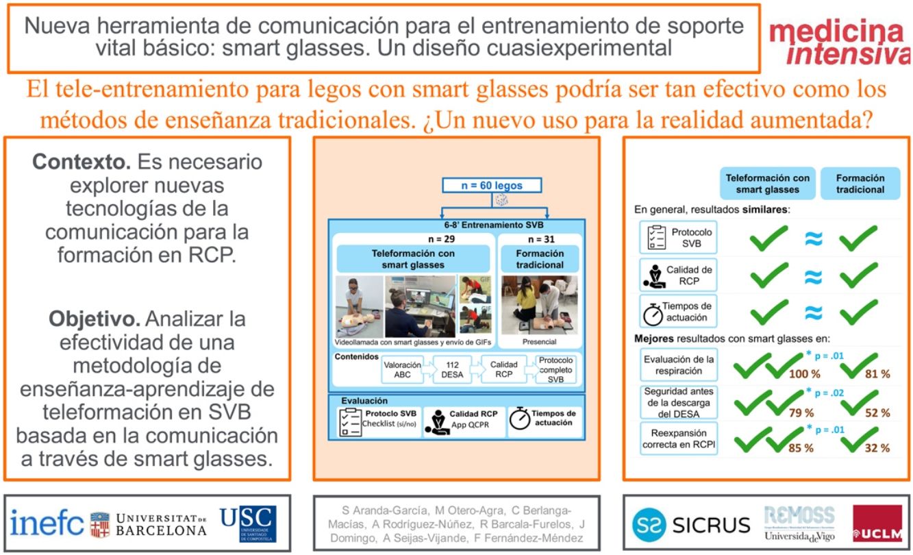 Los avances en las nuevas tecnologías de la comunicación permiten que la enseñanza del SVB también se pueda realizar a distancia. Los programas de educación telemática a través de smartphones podrían alcanzar resultados equiparables a la formación presencial, con el valor añadido de contar con mejores recursos materiales y humanos y accesibilidad a casi cualquier ciudadano8. Dentro de las tecnologías de la comunicación, las smart glasses se han propuesto como un nuevo método de teleformación9–13. Un estudio piloto reciente empleó esta tecnología e informó que experimentar la teleasistencia con realidad aumentada basada en smart glasses fue útil como entrenamiento para aprender el protocolo del SVB y el uso del DEA13. Sin embargo, no obtuvieron resultados óptimos en la calidad de la reanimación posiblemente por el corto tiempo de entrenamiento. Los autores destacaron el potencial de este wearable y consideraron necesarios estudios que comparen su eficacia con programas educativos más tradicionales13.
