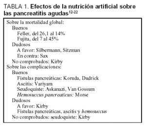 Existen diversas opiniones, incluso en los últimos años, sobre la utilidad o no del empleo de la nutrición artificial (NA) por lo que respecta a su influencia sobre la mortalidad y sobre las complicaciones.