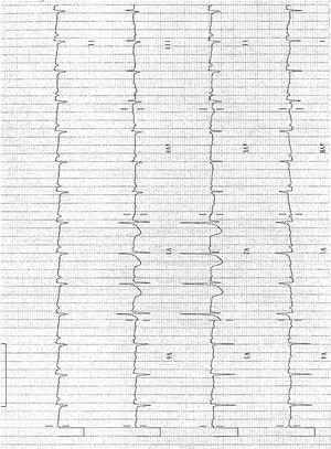 Figura 1. Electrocardiograma: supradesnivelación del segmento ST en V2 e infradesnivelación del segmento PR en I, II, V4 y V5.