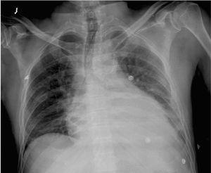 Varón de 56 años de edad, con antecedentes de enfermedad coronaria (infarto agudo de miocardio inferior en 1985, enfermedad de coronaria derecha con tratamiento médico), diabetes mellitus tipo 2 insulinodependiente, hipertensión arterial, ulcus gástrico y bulbar secundario a antiinflamatorios y bursitis séptica estafilocócica cuatro meses antes. Dos semanas antes del ingreso comienza con dolor epigástrico irradiado a región precordial, que aumenta con la inspiración, disnea de moderados esfuerzos y sensación distérmica. A su ingreso presenta tensión arterial sistólica 80 mmHg, frecuencia cardíaca 100 lpm, saturación de O2 con oxigenoterapia 90%, temperatura de 39 ºC e ingurgitación yugular; siendo el resto de la exploración física anodino. En la analítica destaca leucocitosis de 22.640 con 85,5% de polimorfonucleares, troponina 2,43 ng/ml. Electrocardiograma en ritmo sinusal a 95 lpm, elevación segmento ST de 2 mm en V2, mínima elevación en resto de precordiales, descenso PR en V5 V6 y II (fig. 1). Radiografía de tórax con cardiomegalia y discreto pinzamiento del seno costofrénico izquierdo (fig. 2). Se practica ecocardiograma transtorácico y transesofágico que muestran ventrículo izquierdo normal con acinesia inferoposterobasal e hipoquinesia leve lateral, derrame pericárdico severo (20 mm posterior, 7 mm anterior), colapso diastólico de aurícula derecha, leve dilatación de ventrículo derecho, vena cava inferior dilatada (25 mm) con colapso inspiratorio disminuido.