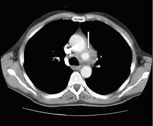 Figura 3. Tomografía computarizada de tórax: imagen de aneurisma en cayado aórtico (flecha).
