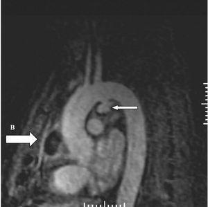 Figura 4. Angiorresonancia magnética nuclear torácica: aneurisma en cayado aórtico (A) y colección intrapericárdica (B).