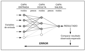 Figura 1. Arquitectura de una red neuronal artificial (perceptrón de tres capas). Los pesos son los parámetros que deben ajustarse durante el proceso de entrenamiento para conseguir que la capa de salida de resultados coincida con los observados. El error entre lo observado y el resultado de la red se propaga hacia atrás (backpropagation) y debe ir disminuyendo en las sucesivas iteraciones en las que se presentan los valores de las variables predictoras. La complejidad de una red depende del número de nodos de su capa oculta.