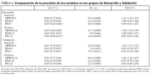 En el grupo de Desarrollo, el modelo MPM II tanto en Admisión como a las 24-horas obtuvo una buena discriminación (ABC de 0,8), pero pobre calibración. Como era esperable, los modelos reajustados (RLR) mejoraron en calibración. Las RN consiguen una mejor discriminación y calibración. En el grupo de Validación se observa similar comportamiento con el modelo MPM II, mejoría en la calibración con los modelos reajustados así como con las redes (tabla 4).