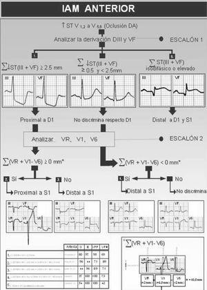 Figura 1. Algoritmo para localizar el lugar de oclusión en la arteria descendente anterior en caso de infarto agudo de miocardio (IAM) con ST elevado de forma predominante en derivaciones precordiales.