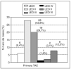La primera TACse realizó en las primeras 4 h posteriores al traumatismo enel 84,4% y en 10 niños con posterioridad. El intervalo detiempo medio (DE) fue de 3,37 (1,94) h con rango entre una y 12 h.El patrón de neuroimagen más frecuente fue LED II(43,8%) seguido de III (29,7%), VI (12,5%) y I (9,4%) (fig 1). Nohemos encontrado diferencias significativas en ladistribución de los diferentes patrones radiológicossegún las edades.