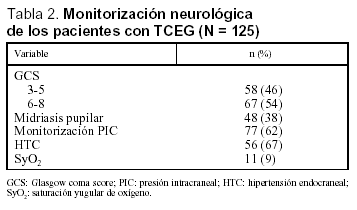 En la tabla 2 se exponen la variables de monitorización neurológica más importantes, destacando que la puntuación del GCS medio fue de 5,4 (1,8), presentando un 46% de los pacientes una puntuación de GCS menor o igual a 5. En 77 pacientes con TCEG se monitorizó la PIC, objetivándose HTC en un 75% de los mismos. De los 11 pacientes en los que se monitorizó la SyO2, en un 62% predominó la situación de baja extracción cerebral de oxígeno (hiperemia cerebral) respecto a la situación de alta extracción cerebral de oxígeno (isquemia cerebral) objetivada en un 23% de los pacientes.