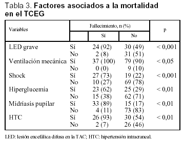 En el resultado del análisis multivariante, la existencia de una lesión encefálica difusa grave fue incluida en el modelo final con un valor de p < 0,1, pero se amplió el valor de significación, dada la importancia del hallazgo y para evitar el posible efecto de variables de confusión.