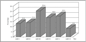 Los hallazgos obtenidos en la TAC se presentan en la figura 2, destacando las lesiones encefálicas difusas tipos III y IV (LED III y LED IV), con una incidencia del 25 y del 19%, respectivamente. Así mismo, en la figura 3 se expone la mortalidad asociada a cada una de las lesiones objetivadas en la TAC, predominando la asociada a la LED IV con un 61% y la LED III y la LEV con un 30% cada una.
