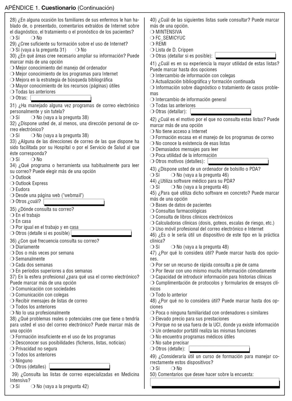Se elaboró un cuestionario con 50 preguntas (Apéndice 1) por cinco intensivistas especialistas en Internet y recursos electrónicos. Hasta donde los autores conocen, no existen cuestionarios validados en la literatura para realizar este tipo de encuestas entre médicos. Por ello, para su diseño se tuvieron en cuenta cuestionarios recogidos de anteriores estudios y de encuestas en Internet para usuarios no médicos. Se realizaron dos revisiones, para así corregir posibles ambigüedades o errores, tras aplicarlo en un ensayo piloto a una muestra de 15 especialistas en Medicina Intensiva.