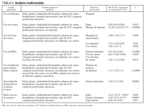 En la tabla 5 se establecen los principales predictores de utilización para cada recurso, la resolución de dudas clínicas por Internet, y la necesidad de formación en al menos un área de conocimiento deficitaria. La mediana del índice de utilización de recursos fue de 3 puntos con un rango intercuartílico de 2 a 4. Es destacable que los médicos residentes usaban menos Internet para resolver dudas clínicas (47% frente a 64%; p < 0,001), y menos correo electrónico (70% frente a 86%; p < 0,001) que los especialistas.