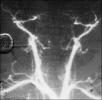 La angiografía cerebral por vía arterial a través de la arteria femoral y técnica de Seldinger y cateterización selectiva de las arterias carótidas y vertebrales es preferida porque permite una valoración sin género de duda de que existe una detención completa del contraste antes de que penetre en la circulación intracraneal. Es mejor que la inyección aórtica porque con este último método existe una superposición o solapamiento de las arterias y es difícil individualizarlas y porque debido al notable enlentecimiento circulatorio no siempre es posible una óptima visualización de la circulación intracraneal por vía aórtica5. Por estos motivos una inyección del contraste selectiva permite asegurarse que el diagnóstico es enteramente correcto.