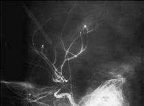 Fig. 5. Proyección lateral de una angiografía convencional en un paciente con trauma craneal y criterios clínicos de muerte encefálica. En contra de lo esperado la exploración muestra un llenado de las ramas de la arteria cerebral media y anterior con estiramiento y rectificación en relación con intensa hipertensión intracraneal. La porción supraclinoidea de la carótida interna se encuentra afilada. El catéter se posicionó muy craneal y la inyección del contraste a alta presión, lo que forzó la entrada intracraneal del contraste. Repetida la angiografía 24 horas más tarde se confirmó la ausencia de relleno intracerebral.