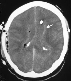 Al octavo día ingresó en la Unidad de Cuidados Intensivos en situación de coma (Glasgow Coma Scale [GCS] 5 puntos). Tras intubación y estabilización hemodinámica se realizó TAC craneal con contraste, observándose persistencia de hidrocefalia a pesar de válvula ventriculoperitoneal. La analítica de ingreso fue: hemoglobina 10,8 g/dl, leucocitos 7.200/mm3, plaquetas 225.000/mm3; sodio 147 mEq/l, potasio 6,4 mEq/l, glucemia 148 mg/dl y creatinina 4,2 mg/dl. En el LCR: hematíes 7.200 células/mm3, 400 células/mm3 l (95% polimorfonucleares), glucosa 60 mg/dl y proteínas 814 mg/dl. Se aisló, L. monocytogenes sensible a ampicilina y vancomicina. Se realizó craneotomía temporal derecha con exéresis de absceso cerebral sin retirarse la válvula ventriculoperitoneal. En el cultivo creció el mismo microorganismo. Pocas horas después el paciente presentaba GCS de 3 puntos, pupilas medias arreactivas. En la TAC craneal (fig. 2) se apreciaba ocupación ventricular por material de similar densidad que el parénquima cerebral. Se drenó material purulento semejante al evacuado del absceso por punción del reservorio de la válvula. En situación de shock séptico se objetivaron signos clínicos de muerte encefálica, que se confirmó mediante eco-doppler transcraneal. El enfermo falleció a las 24 horas de la intervención.