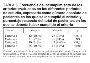 Criterio 1: administración de sucralfato en pacientes con VM; criterio 2: respeto profilaxis antibiótica; criterio 3: normas estrictas de asepsia en inserción de catéteres vesosos centrales; criterio 4: normas de asepsia estrictas en inserción de sonda uretral.