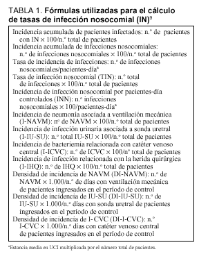 En el primer período se siguió un sistema de vigilancia prospectivo de las IN intra-UCI, registrando el tipo de infección y los días de exposición a los distintos dispositivos o factores de riesgo. Asimismo, se realizó la toma de muestras para cultivo y la caracterización de los microorganismos patógenos responsables. Los diversos procedimientos instrumentales aplicados a los pacientes durante el primer período de estudio se efectuaron de manera habitual, pero sin vigilancia ni control específico alguno. Tanto la prescripción de fármacos para la prevención de la úlcera de estrés (anti-H2) como la antibioterapia profiláctica y su duración quedaron a criterio del médico responsable. Se calcularon las siguientes tasas globales de IN9 (tabla 1): incidencia acumulada tanto de infecciones como de pacientes infectados, incidencia acumulada y densidad de incidencia de infección por dispositivo de riesgo estudiado, como expresión del riesgo global para todos los enfermos ingresados durante cada una de las fases del estudio.