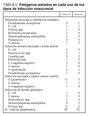 Los patógenos aislados en las diferentes IN se detallan en la tabla 5. En el grupo A, de un total de 45 aislamientos, 18 (40%) correspondieron a gramnegativos, 24 (53,3%) a grampositivos y 3 (6,7%) a hongos (Candida spp. en todos los casos). Por otra parte, en el grupo B, de 32 gérmenes aislados, se obtuvo idéntico porcentaje de gramnegativos (46,9%) y grampositivos (46,9%), siendo el resto Candida spp. (6,25%).