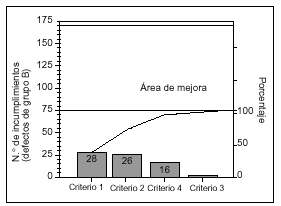 Los datos obtenidos respecto a la frecuencia y porcentaje de incumplimiento de los criterios propuestos en el protocolo de mejora se indican en la tabla 6. En el grupo A se produjeron un total de 168 incumplimientos frente a 72 en el grupo B, reducción que fue significativa para los criterios 1, 3 y 4. La representación gráfica en diagramas de Pareto antes-después de los incumplimientos del protocolo en el grupo preintervención y grupo postintervención se reflejan en las figuras 1 y 2. Dicha representación gráfica nos permite evidenciar la magnitud de la mejora conseguida tanto de cada criterio indi vidualmente como la global (área de mejora), ex presada por la diferencia entre el número total de incumplimientos durante la primera y segunda evaluaciones.